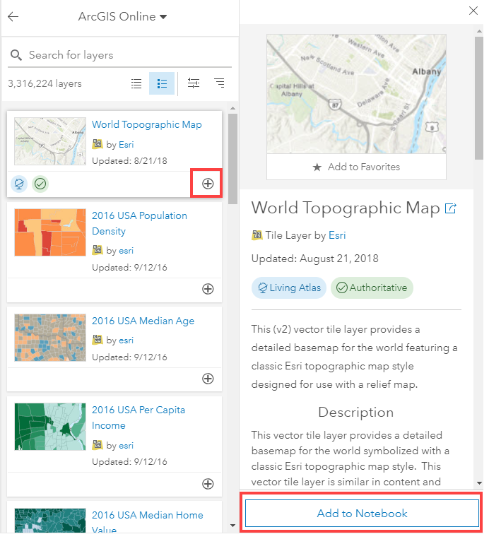The notebook editor provides a sidebar where you can browse, search, and add portal items such as layers and web tools to your notebook. Starting at 10.8, any portal item can be added to a notebook as a code snippet in a new cell. The item can be hosted in your organization or publicly available in ArcGIS Online or ArcGIS Living Atlas of the World.